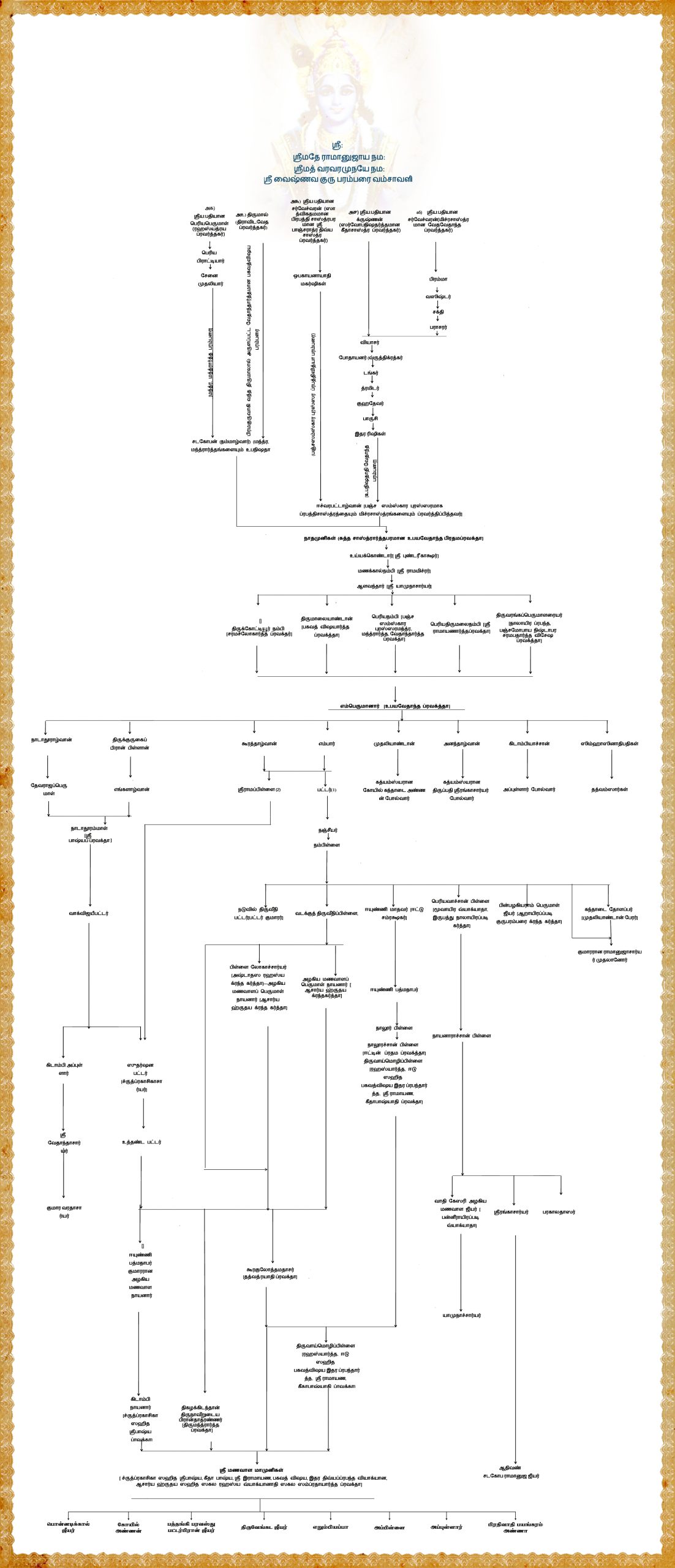 ஸ்ரீ வைஷ்ணவ ஸம்ப்ரதாயத்தின், அடிப்படையே ஆச்சார்ய குருபரம்பரை தான். ஆசார்ய ஸம்பந்தம் இல்லாமல், எந்த செயலுக்கும், நடை முறைக்கும், அர்த்தம் இல்லாமல் போய்விடும் என்பார்கள் பெரியோர்கள். ஸ்ரீமந் நாராயணனை முதல்ஆசார்யனாகக் கொண்டு ஆச்சார்ய பரம்பரை விருக்ஷம் கீழே கொடுக்கப்பட்டுள்ளது.